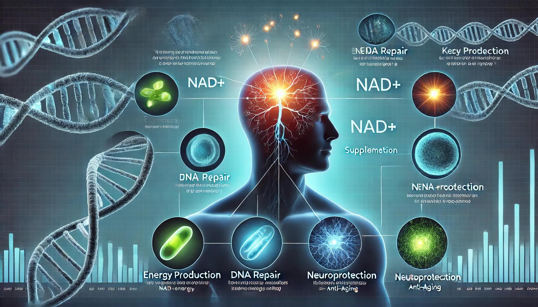 Di recente quindi si è studiata bene l'integrazione con precursori del NAD+, come la nicotinamide riboside (NR) e la nicotinamide mononucleotide (NMN), per i potenziali benefici sulla salute nel mantenere alti i livelli di NAD+ nel corpo.